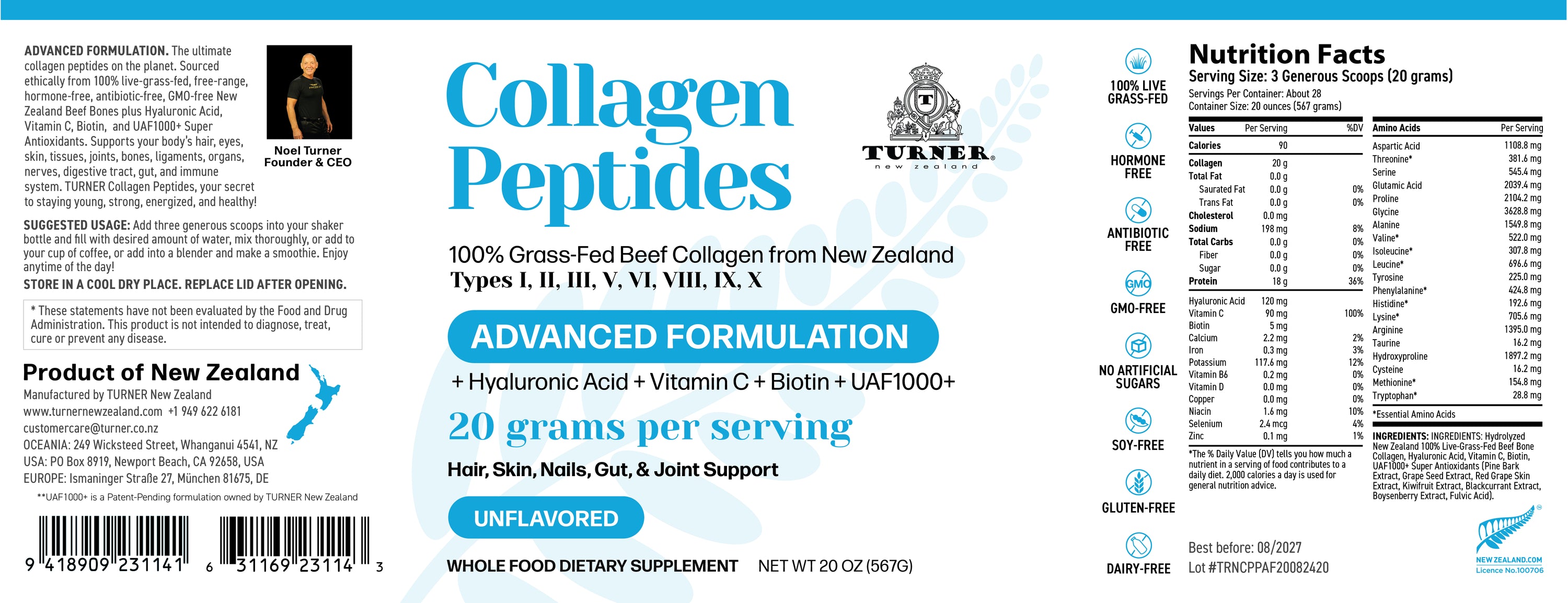 • Hydrolyzed Collagen Peptides (NZ 100% live-grass-fed)20 g per serving (3 generous scoops)